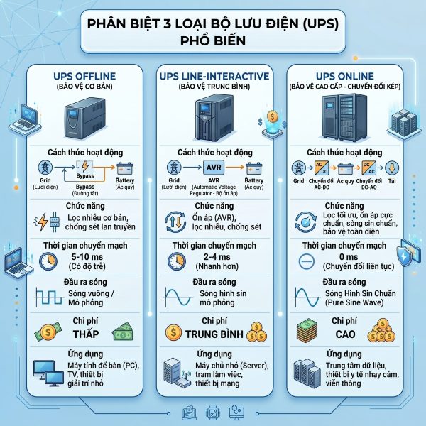 Ba loại UPS phổ biến nhất hiện nay là UPS Offline, UPS Line-Interactive và UPS Online. Mỗi loại phù hợp với một nhóm nhu cầu khác nhau.