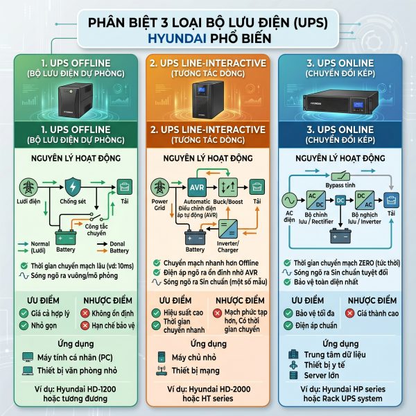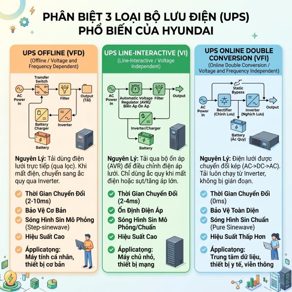 | Tiêu chí | UPS Offline | UPS Line-Interactive | UPS Online |