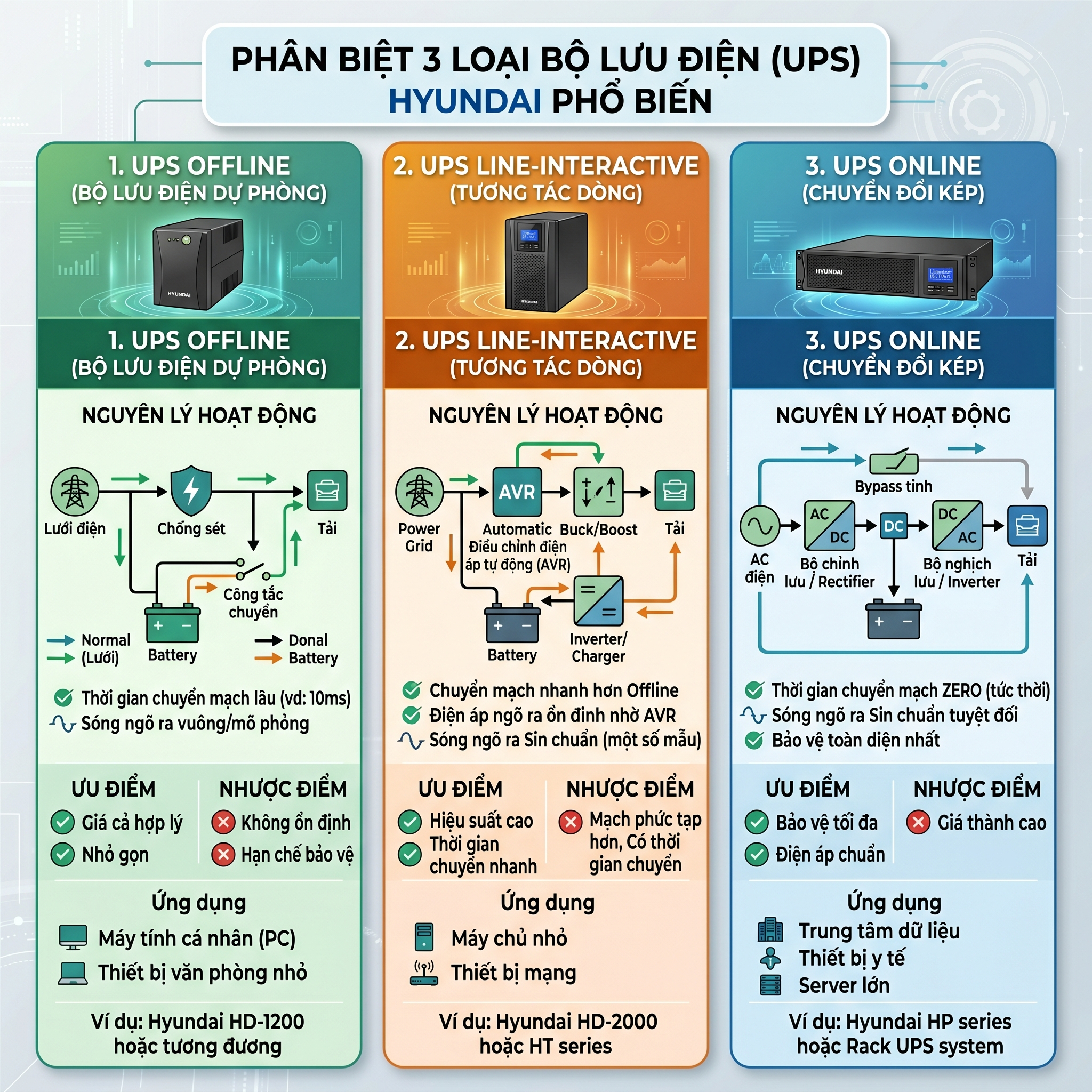 Trên thị trường hiện nay, 3 loại UPS phổ biến nhất là UPS Offline, UPS Line-Interactive và UPS Online. Mỗi loại có cấu tạo, nguyên lý hoạt động, khả năng bảo vệ thiết bị và mức giá khác nhau. Vì vậy, việc phân biệt các loại UPS là bước rất quan trọng trước khi mua.